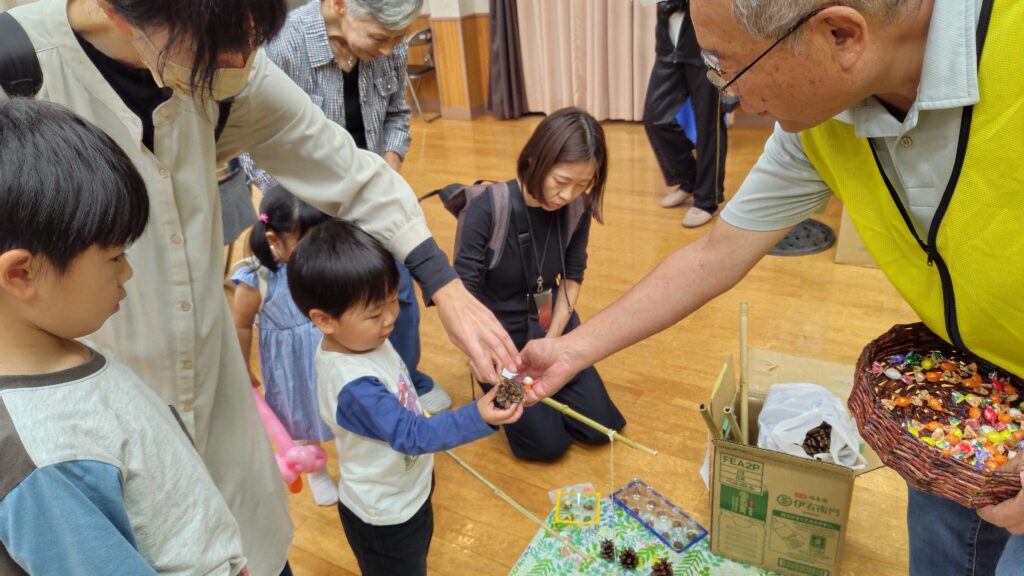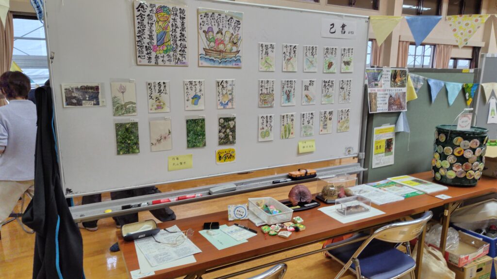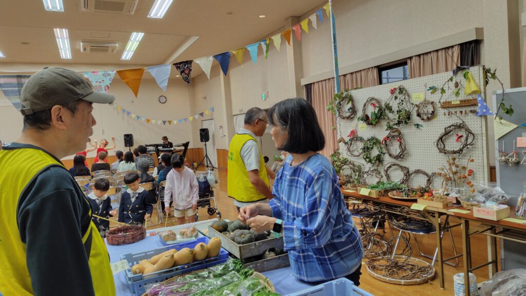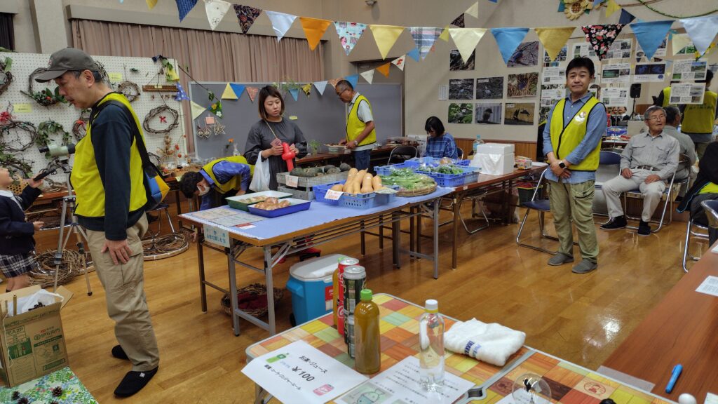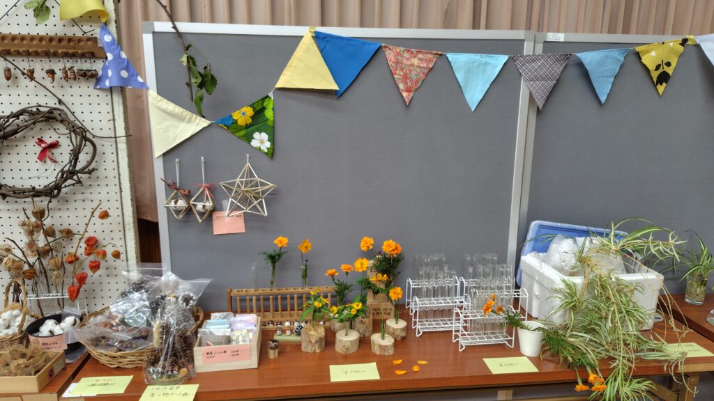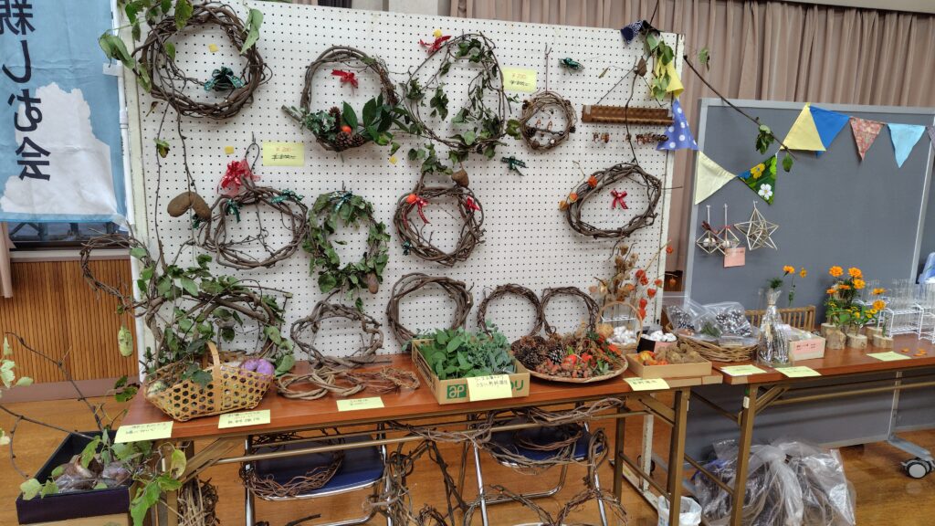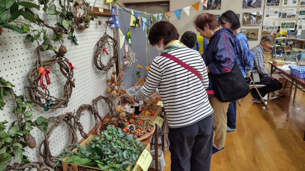 当日は、活動紹介や市内の動植物の写真展示に加え、無農薬野菜・サンドイッチ・飲み物の販売、自然をテーマにした己書やリースの展示販売などを行いました。また、自然素材を使った手作りゲームもご用意し、来場された皆さまに楽しんでいただきました。